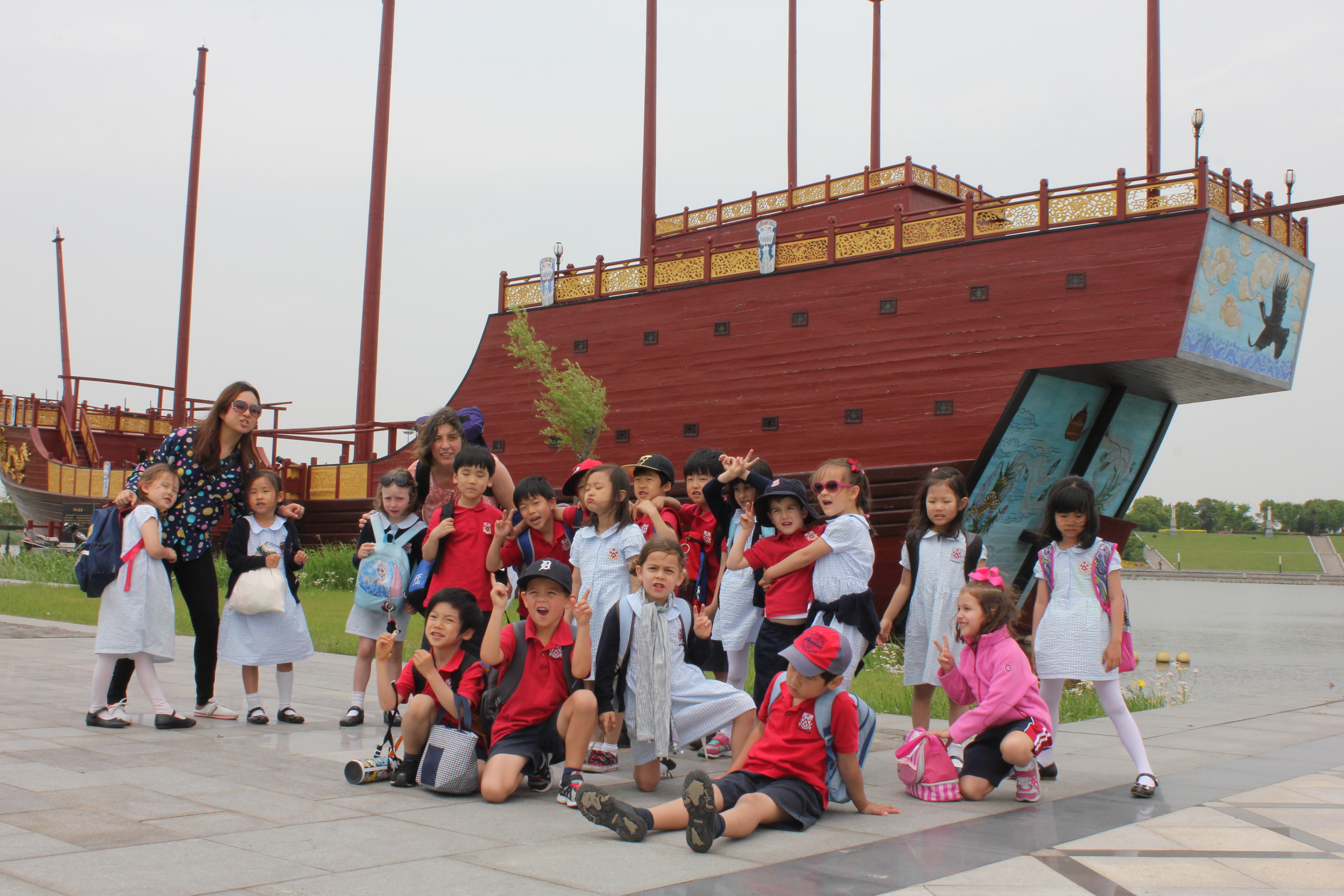 Trinity Term in March saw the School participate in Earth Day. This time we were asked to provide old material. A couple of my tops were donated and fabric collages were made in an effort for the children to think about the mantra “REDUCE, REUSE, RECYCLE”. Sadly we have moved compounds where they don’t have recycling bins as they did in our old compound. But I know, that the rubbish gets emptied out and people pick through the rubbish looking for anything that can be sold on. But they could save some of the hassle by having it already separated. The clay again made a feature as they made smaller clay pots in order to plant seeds in. I think the pots have just been painted as sadly it took a while for the pots to be fired ready to be used. The children have also had two school outings since March. One of which I didn’t go on. The first one was to Baitang Arboretum which dovetailed nicely into their topic on seasons. The blossoms were out and the weather wasn’t too hot, and the Year 1’s had a great time. The Arboretum is where we live opposite now, and Eleanor likes to remind us that she has been there more than we have, she even pretended to be our tour guide when we walked around it for the first time! It is lovely and peaceful with lakes (big ponds really) and secluded pathways, but it does get busy (negating the peacefulness) at the weekends. The last outing I did go on, was an 1.5 hours away, I was allocated 4 children who were all interested in different things, with only two hands and two eyes on 4 kids – it was exhausting! Hats off to all the teachers out there. Zheng He’s Memorial Park in Taicang is a museum and park dedicated to the Chinese mariner, explorer, diplomat, eunuch and fleet admiral during the Ming Dynasty. Zheng He (1371-1433) made seven expeditionary voyages (eventually dying at sea) to South East Asia, South Asia, the Middle East and East Africa. In his expeditions (1405-1433) he visited Brunei, Java, Vietnam, Thailand, South East Asia, the horn of Africa and Arabia. On his way, he presented gifts such as silk, porcelain, gold and silver, and in return he received novelties such as ostriches, zebras, camels and ivory. He established routes between China and the Arabian Peninsula and established a Chinese control under the Indian Ocean reaching as far as the Eastern Roman Empire. (Wikipedia) It is said that he even arrived to Australia, as well as some claims that he made it to the Americas. (However, that hasn’t been proved). What is proved is that due to his travels the Chinese emigrated and colonised South East Asia resulting in tributary trade that lasted until the 19th century (Britannica). This man caught the imagination of Eleanor, and I think the rest of her classmates. It is fair to say that I don’t think any Western parent had any idea who this man was, but what sticks in the mind is that he went to Somalia and thought he had got a unicorn. What in fact he had was a giraffe. My oracle is currently in bed, and she will correct me if I have this wrong…but I think the word for giraffe in Somalia, was the same word as the Chinese used for unicorn. A simple mistake to make! The ships were massive, the size of one and half football pitches, 9 masts, 4 decks and able to carry 500 passengers and other cargo besides. Zheng He allowed the Chinese to share and trade their knowledge and technology to the world – including the compass and gun power, two very important things that changed the world forever. The school buses that took us were full of excited children on the way there, and parents who were thinking what have we let ourselves in for. The way back was much quieter as some of the children and their parents fell asleep.