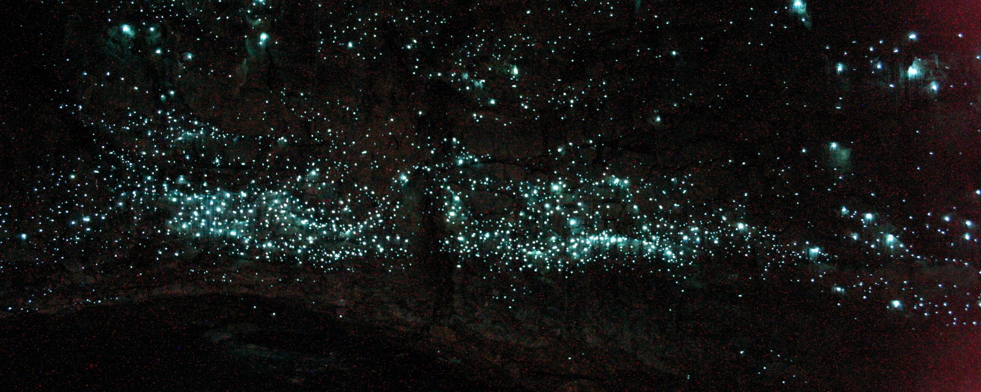 Into the mouth of the cave, alongside the river. We went a few meters, turned our headlamps off – pitch black. Our eyes hadn’t adjusted and so it was just black. We couldn’t our hands let alone the person beside us. We ventured further into the cave by torchlight, and then we turned our lights off again. By Norm’s torch we saw tiny threads. The glowworm makes its home in the cave by attaching a silk hammock to the cave ceiling. To catch food, the glowworm larva builds a network of silk threads that hang down vertically all around, and also within reach of its hammock. As the glowworm extrudes each line from its silk glands, it places droplets of very sticky mucus over the thread line. Then the torch was turned off, and we saw little tiny lights, the glowworms. The pictures that I took, are mostly black.