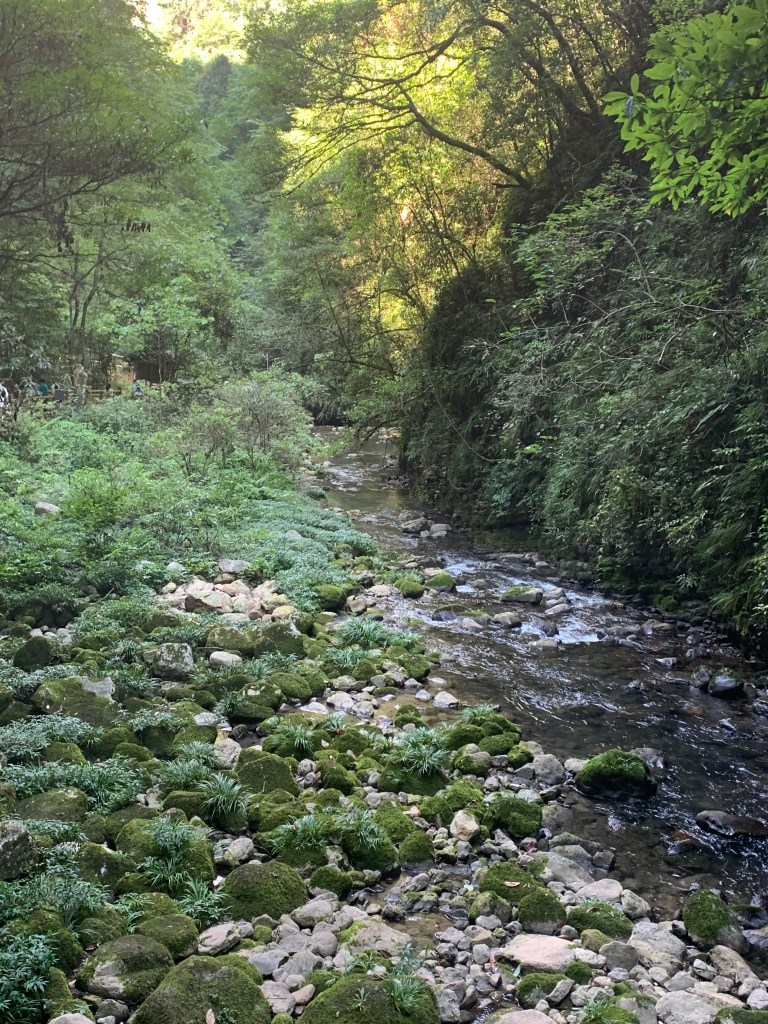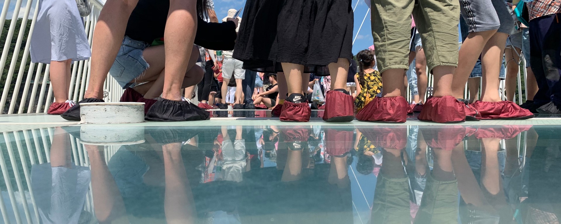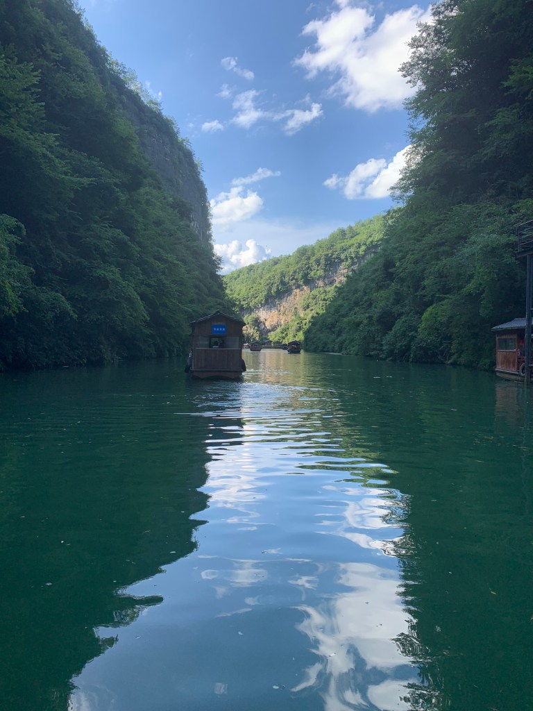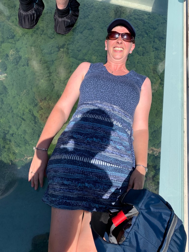 We all were given coverings for our shoes and off we went. They are still constructing the visitors centre on the other side of the bridge which includes another lift, but with stairs and a slide *not glass* we were soon in the valley walking along the shaded riverbank which brought us to a dock where we got on a boat to get back to our bus. I don’t know what the other bridges are like in terms of their construction material of glass v concrete or similar but we were all quite happy to walk on it, have photos on it etc, but I would not have bungy jumped of it.