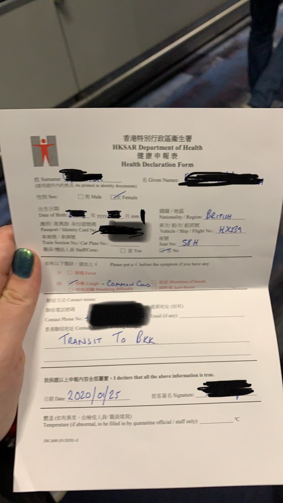On the Hongqiao to Hong Kong flight we were all given a health declaration form. I duly completed it, even including Eleanor’s chesty cough but at Hong Kong no one asked for it. I assume it was because we weren’t travelling into HK but I had assumed that no matter the destination, this information would have been useful.