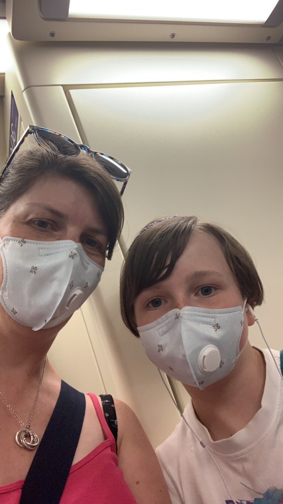 We had raided our nurse’s station in boarding and got surgical face masks. Both of us have a small face, and while not tight on our faces, it kept us from standing out as people not wearing them were definitely in the minority. A guy came to check in for the flight in mask and his swim goggles. He may have looked ridiculous but he was definitely safe.