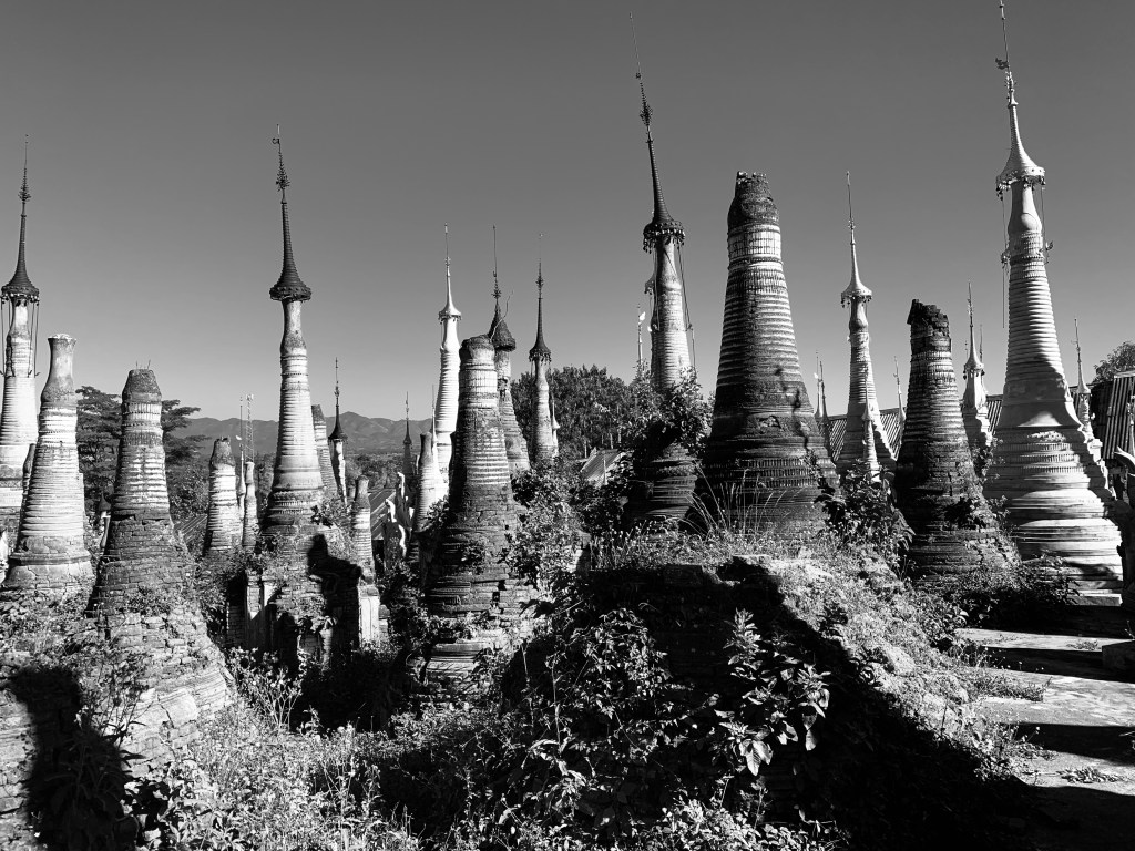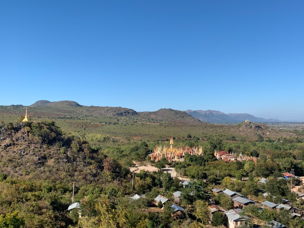 From Yangon we went to Inle Lake – and had been told by our guide in Yangon to go to Indein Village so see the Shwe Indein Pagoda. We walked up from the river and had to pay a photography fee. I got a tiny receipt on an elastic band and put it on my bag. We didn’t know whether it was a scam or not, but when we went to Bagan I saw some other people sporting the receipt so either we were all scammed or it was legit. Inle Lake will be a blog in its own right, but in keeping of the theme of pagodas and stupas, Indein Village on the banks of a tributary river of Inle Lake has its own share of Buddhist pagodas and stupas. 1600 of them approximately dotted all over the countryside. Many of them are in disrepair, and others exceptionally well kept. Emma and I hopped on two motorbikes (with drivers) and we were taken up to a look out point. The journey was less than 5 minutes and it was heartstopping as we went off roading on a narrow path – the path the width of the bike tyre and once we had got over the mild panic we scrambled up onto the rock and were met with panoramic views. Eleanor and Martin chose to stay behind in the coolness of the covered walkedway that led from the village up the hill.