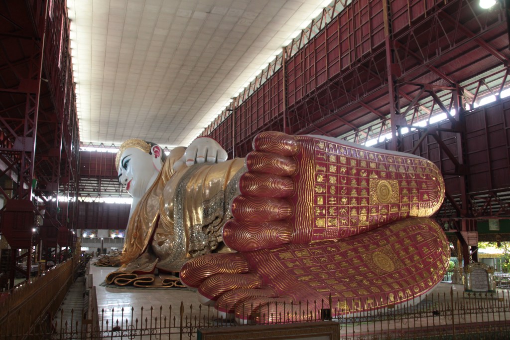Our first visit was to Chauk-htat-gyi Buddha Temple a 65m reclining buddha, complete with red nails and red lipstick – as teachers we are alert to nail polish and lipstick on students so it was funny to see a statue with such prominent features.