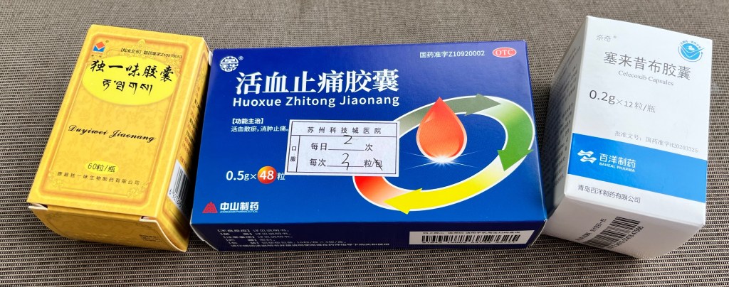 The doctor put cold compress gel pads on my shoulder and back and discharged me with some drugs – that I haven’t taken. I have stuck to ibuprofen rather than TCM (traditional Chinese Medicine) which I believe the one on the left is.
