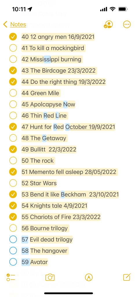 I am never going to get to the heady heights of quoting from films. I am just not wired that way. But I have enjoyed/am enjoying watching these films. Below is the list. When I initially shared it, people were generally in agreement that this list was a good starter for 40 (or indeed 101) and whenever I share what film I have just seen, generally it sparks conversation of favourite parts or memories of scenes.