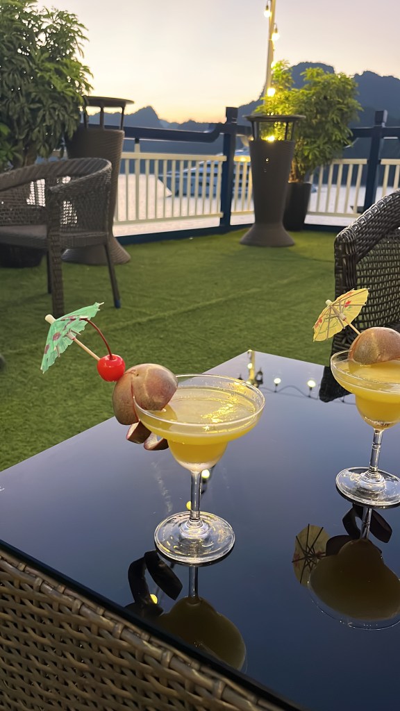 The wine actually stayed in the fridge in my room until after the boat trip not least because we paid for bottles of decent wine and there was happy hour on the upper deck of buy two cocktails get one free. “I am Vietnamese” was my cocktail of choice.