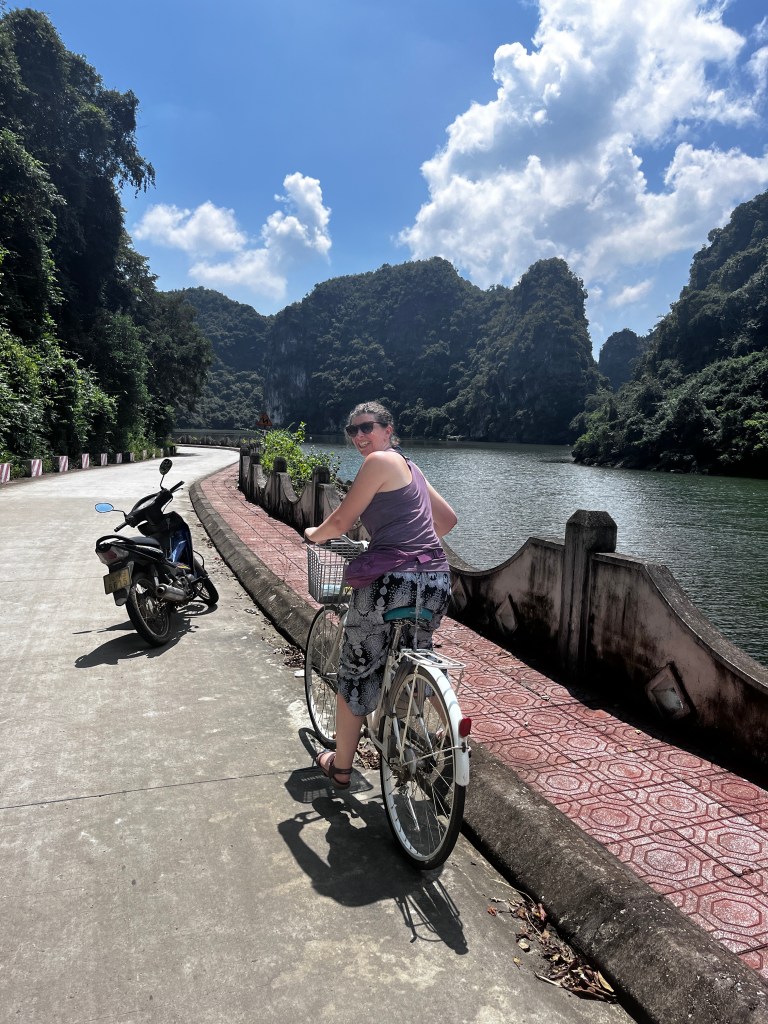 Eventually we arrived at Catba Island. On arrival we were given the choice of bicycle or electric golf buggy. Three of our party of five chose the active option while the others took the buggy. The cycling three had three hills to content with, and while I had to walk my bike up the hills, I then feared for my life on the way back down wondering if my brakes were good enough. The island was beautiful and we were taken to a place where the guide told us of his history, first as a pilot and then going into the tourist industry. There were snake skins in preserving liquid, and we knew that they had been fairly new in being cast off. The village had only recently had electricity, but it’s main source of income was tourists.