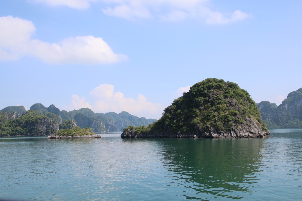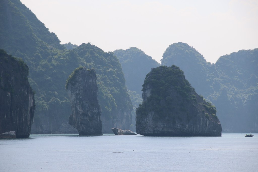 Halong Bay is a World Heritage Site and you can see why, it is stunning. Halong means “descending dragon” I guess because the karsts looked liked scales on a dragon’s back. The karsts are formed of limestone and there are thousands of inlets. Wikepedia has this piece of knowledge… “During the Vietnam War [American War (depending on the side)], many of the channels between the islands were heavily mined by the US Navy, some of which continue to pose threats to shipping routes in the present day”. Possibly this is why all the boats congregate in particular areas.