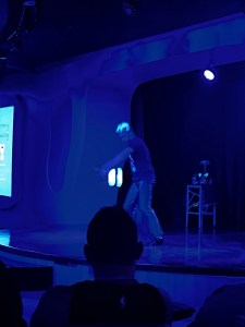 I went to Azure Lounge for a 10:30pm show of “Jeremy Penguin” a juggler from New Zealand. But before his show I stumbled upon an interactive quiz just before. I stood at the doorway of the Azure to survey where I could sit. There were people on the stage area on the floor looking like they were slo-mo crawling. I stayed at the doorway for a bit longer to realise it was a game show of sorts with two contestants. These two contestants had come from different sides of the room which had effectively divided the room into two teams. They had buzzers and it was name that tune from a TV series or advert. A few of the questions had to be canned because it appeared that the adverts hailed from America and hadn’t been shown in Australia. Along the way there were challenges for the teams, one of which included dancing in sync to whatever the contestant decided to do. It was well done and funny but I was glad that I hadn’t been there for the start of the show to participate.