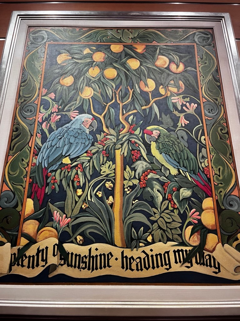 Dinner was at Tiana’s Place which is themed from The Princess and the Frog released in 2009. A film I have never watched given that Eleanor was hardly one when it was released. The restaurant was New Orleans themed and even the purple, green and gold beads were handed out. (The colouring means justice, faith and power), thankfully the beads were on the table and none of had to bare flesh like in days of old! There was singing and a conga. The singing from the group was great, but it was such a contrast from the quieter Animator’s Palatte that we struggled to have a conversation with our tablemates. None of us participated in the conga led by the crocodile. (No pictures!)