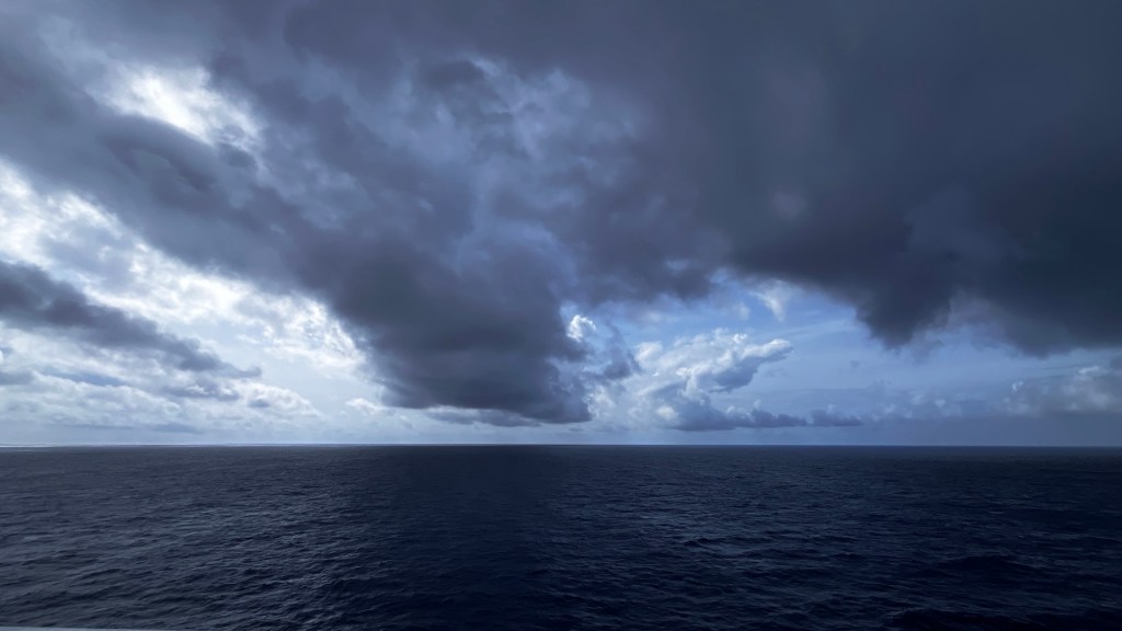 From the tasting I met Martin and we had a sit down lunch in Tiana’s. I had a clam chowder followed by steak frites (frites were overdone) followed by a lemon meringue pie. After lunch, Martin and I went up onto deck 10. He slept and I had a picture taken with Minnie. Martin then left, and was replaced by Eleanor. At 3:15pm ish the clouds descended and I got cold.