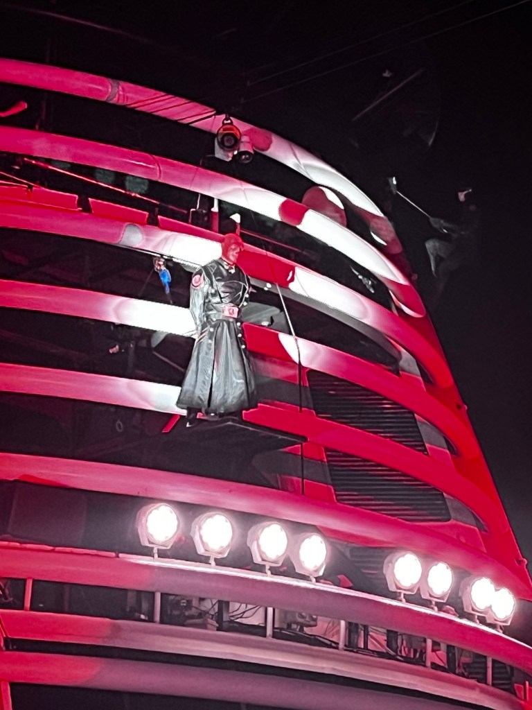 Eleanor and Martin are definitely the Marvel superhero aficionados but I went along to see what was going on. The good guys which included Spiderman, Captain Marvel, Captain America and Thor took on Loki and some guy with a red mask. Now Loki – is Thor’s brother and for some reason unknown to me Loki and Thor aren’t best mates. (I have no doubt there may be some readers who will have followed this and understood that I know very little, and there will be others who know even less than I do (my parents for starters). But whatever you do or don’t know, this open air show drew a crowd and the combat fighting, aerial work, timing and pyrotechnics were excellent.