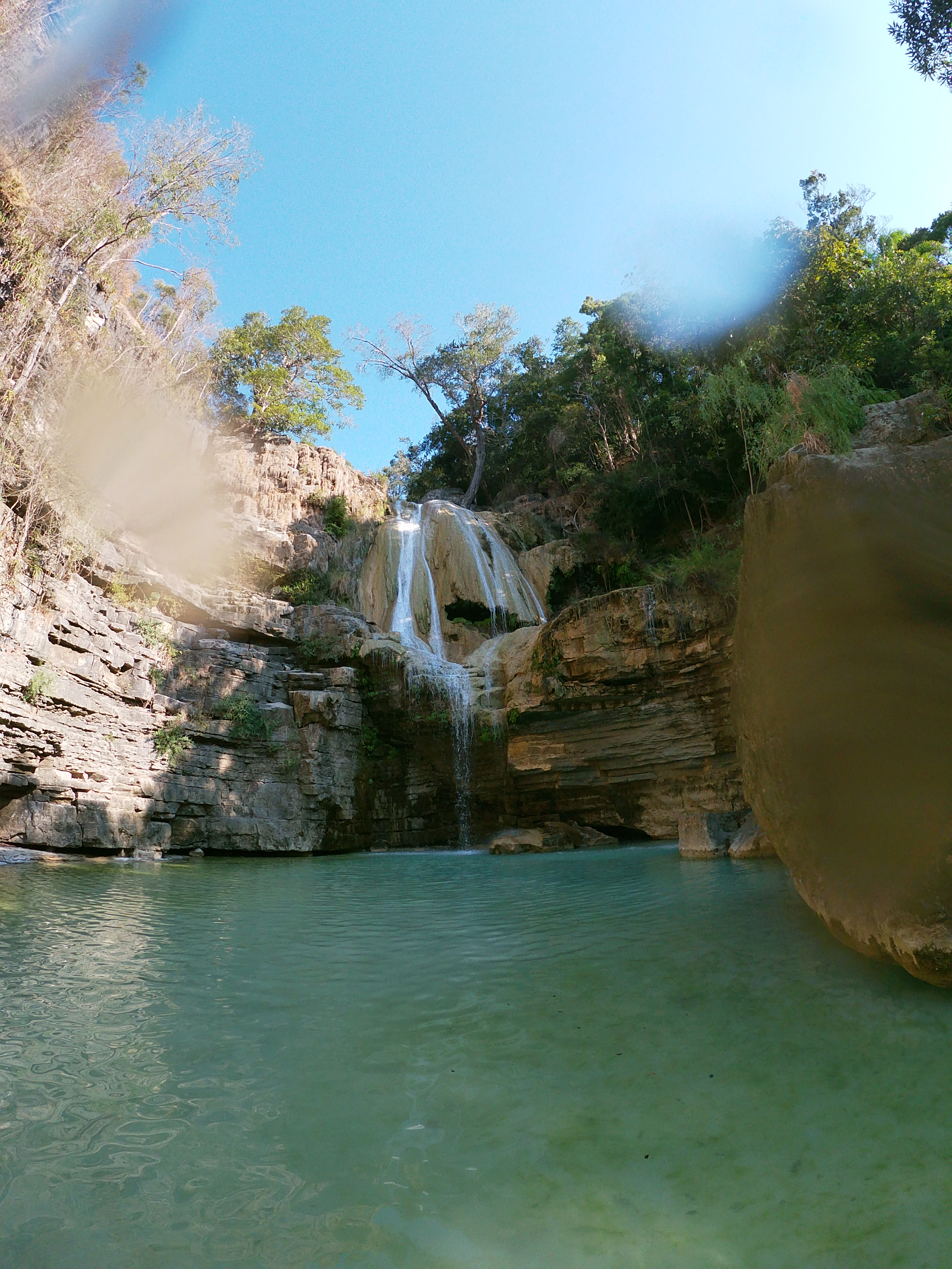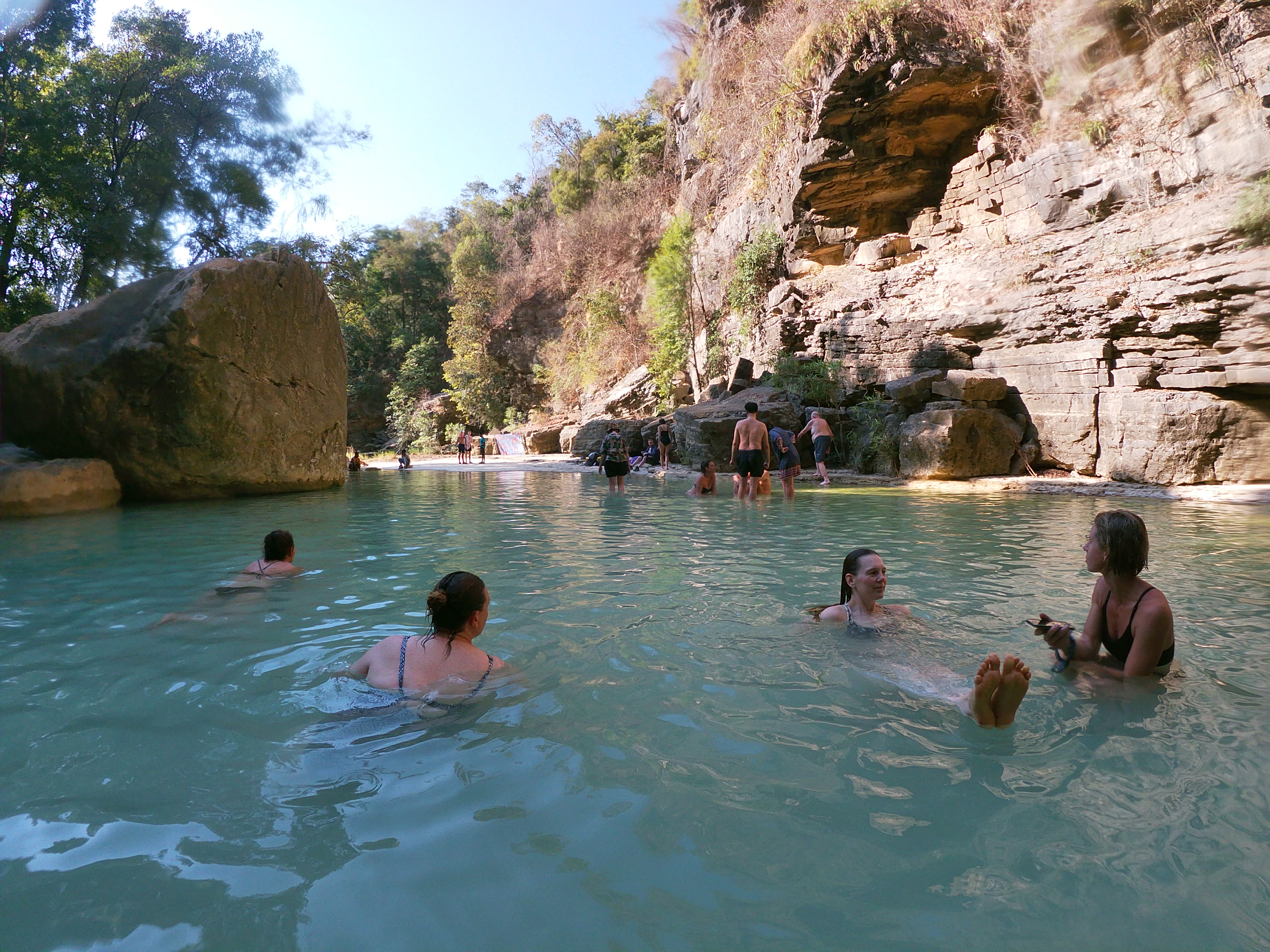 Most of us changed into swimming togs and went in. It was refreshingly cold and I felt much better just having a dip and putting my head under the falls which don’t look much but the water that was falling pounded my head as I dipped under. We had the pool to ourselves and while we didn’t stay long it was long enough to be refreshed in the shade and get onto land for more time than a quick bushy bushy.