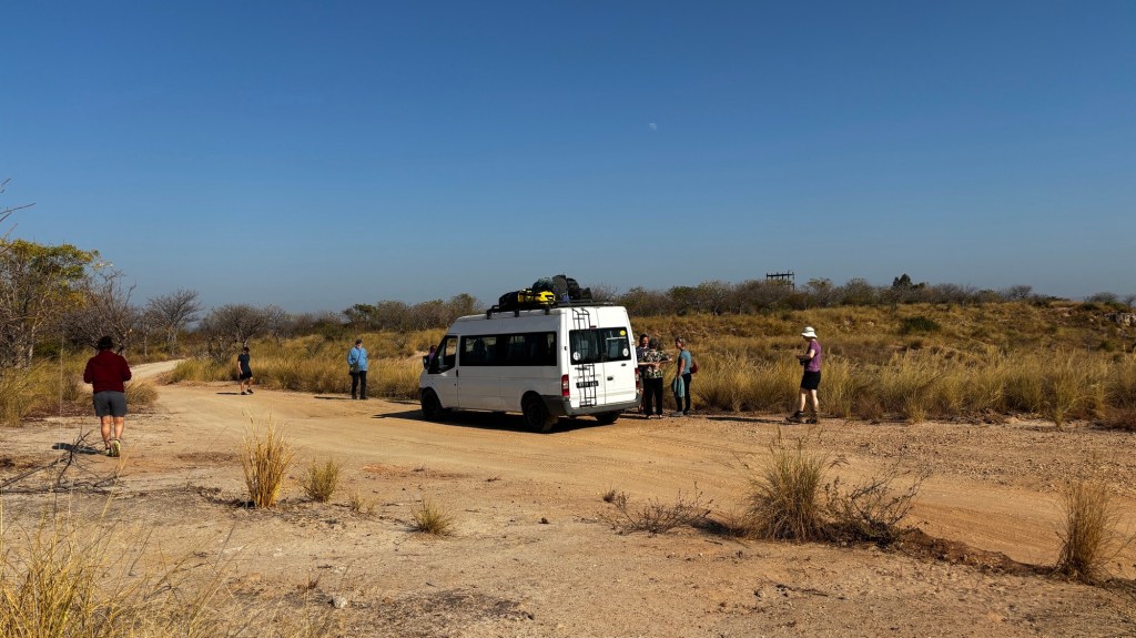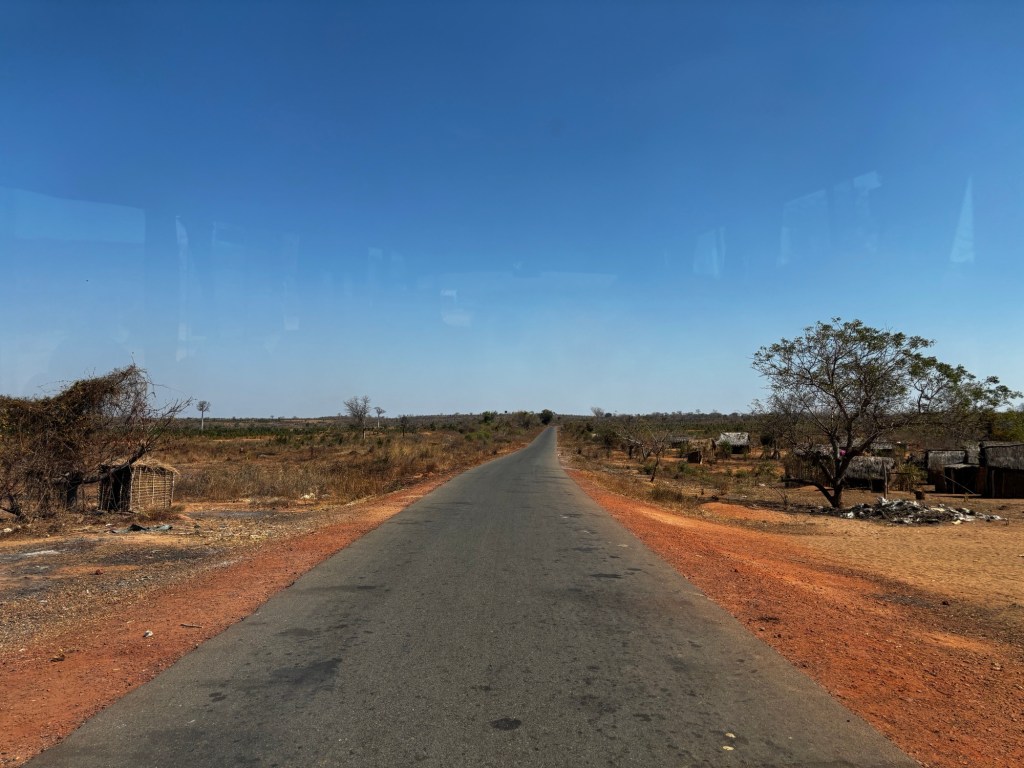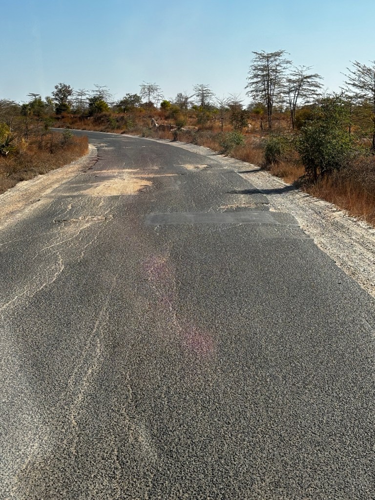 We got into a smaller bus and drove on the last bit of good road that we would see for six days! The road hadn’t been great anyway, with the previous day’s journey ending after sunset, Etienne had navigated some pretty enormous potholes. They weren’t really potholes more like craters, someone described it as potholes loosely held together with bits of tarmac. Etienne would build up speed only to slow down again and then zigzag his way round the craters every 200 metres or so.